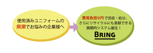 - ユニフォームを廃棄する際は産業廃棄物扱いになりますが、 BRINGシステムでは使用済ユニフォームを再生ポリエステル を精製するための≪原材料≫として買い取るため産業廃棄物にはあたりません。